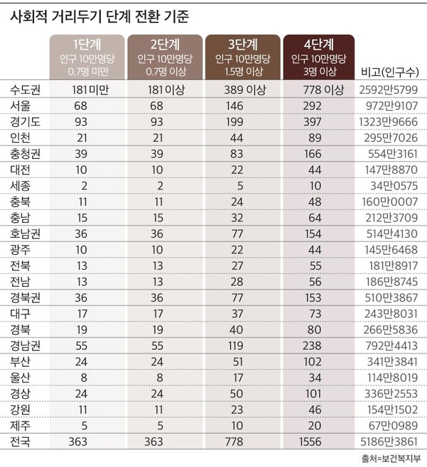 단계 결정 기준은 '인구 10만 명당 주간 하루 평균 환자 수'가 핵심입니다. 이 수치가 0.7명 미만이면 1단계, 0.7명 이상이면 2단계, 1.5명 이상이면 3단계, 3명 이상이면 4단계입니다.