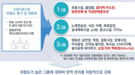 다중시설은 3그룹으로 분류되며, 단계에 맞춰 일부 시설에 대한 영업 제한 조치가 다시 시작될 수 있습니다.